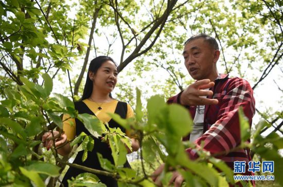 一位村民(右)在板栗種植園向魏先曼介紹今年的板栗種植情況(4月10日攝)。