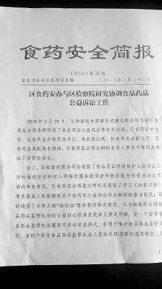 經(jīng)過(guò)努力,6個(gè)基層院共向當(dāng)?shù)毓ど绦姓块T、食品藥品監(jiān)督管理部門發(fā)出檢察建議16件。沙坪壩區(qū)檢察院還與該區(qū)食藥監(jiān)分局會(huì)簽了《關(guān)于加強(qiáng)食品藥品領(lǐng)域公益訴訟工作協(xié)作的意見》,就公益訴訟案件線索移送、證據(jù)收集調(diào)查的協(xié)作、建立執(zhí)法聯(lián)席會(huì)議制度、訴前監(jiān)督程序以及提起公益訴訟工作等達(dá)成了一致意見。