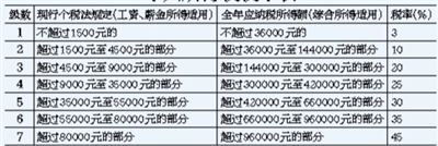 修正案草案將工資、薪金,勞務(wù)報酬,稿酬和特許權(quán)使用費等4項勞動性所得(下稱“綜合所得”)納入綜合征稅范圍,適用統(tǒng)一的超額累進稅率。綜合所得適用3%至45%的超額累進稅率。wJP安康新聞網(wǎng)