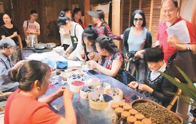 除了民宿,“云上平田”還創(chuàng)立了“云纈坊”非遺品牌,曾就讀于紹興文理學(xué)院紡織工程系的松陽(yáng)青年葉科將茶扎染帶進(jìn)了小山村。葉科說(shuō),“云纈坊”把松陽(yáng)本土的綠茶、紅茶作為扎染染料,因茶內(nèi)富含茶多酚,扎染后的紡織品具有親膚、除臭、防過敏的功效,成為眾多游客體驗(yàn)的項(xiàng)目。如今,“云纈坊”的染織業(yè)務(wù)還拓展到了扎染蠟染、傳統(tǒng)刺繡、竹編草編、端午香包、發(fā)簪女飾、年畫年俗、服飾拼布等。遇到需要手工縫制的文創(chuàng)產(chǎn)品時(shí),葉科還請(qǐng)村里會(huì)針線活的老人幫忙加工,不僅增加了老人的收入,還讓他們感受到了自己的價(jià)值。