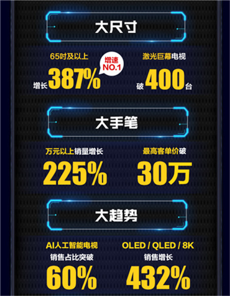 剛剛過(guò)去的818,蘇寧家電的主場(chǎng)表現(xiàn)更是引領(lǐng)整體市場(chǎng)的銷(xiāo)售風(fēng)向。65英寸及以上彩電收獲387%的增長(zhǎng),增速行業(yè)第一;大屏新銳激光電視,單天銷(xiāo)售突破400臺(tái);萬(wàn)元以上高端機(jī)型,銷(xiāo)量增長(zhǎng)225%;作為新顯示技術(shù)代表的OLED、QLED、8K電視,銷(xiāo)售增長(zhǎng)432%;AI人工智能電視銷(xiāo)售占比突破60%。