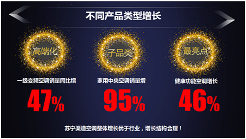 蘇寧易購大數(shù)據(jù)平臺顯示,產(chǎn)品結構變化的方向有三:一、高端化趨勢如一級變頻空調銷量同比增47%;其二、以家用中央空調為代表的子品類銷量增長95%;其三、功能趨勢最大亮點,健康功能空調增長46%。