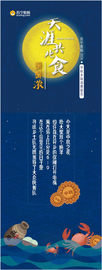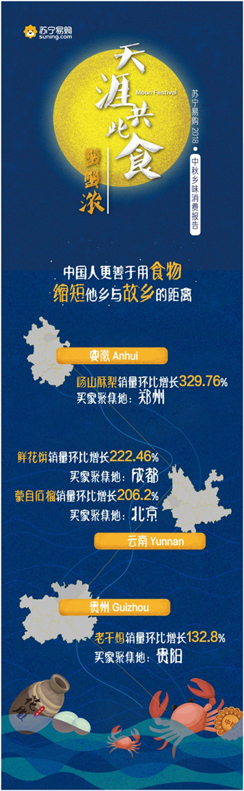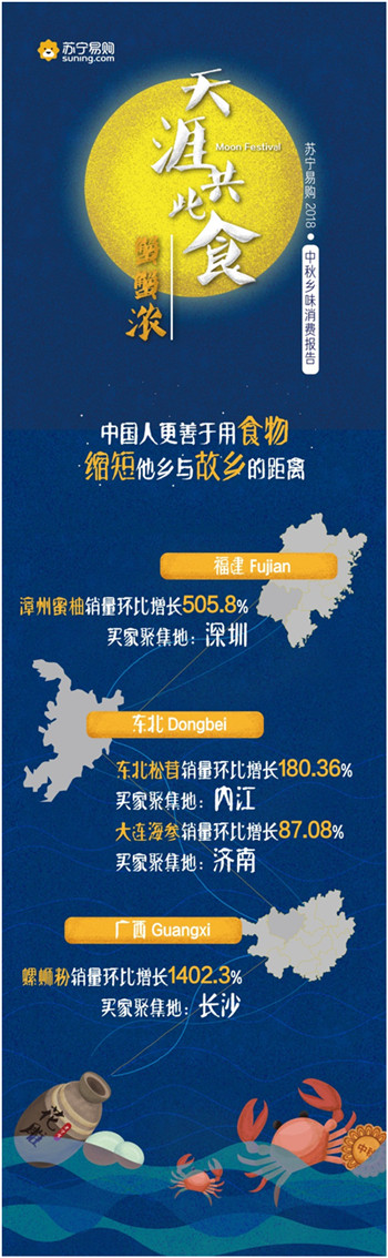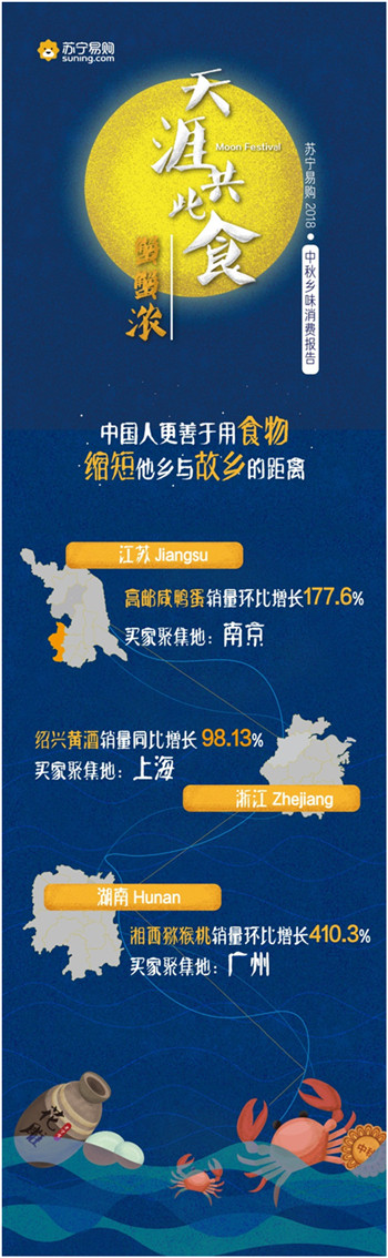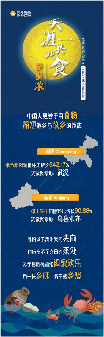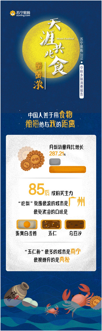 9月23日,蘇寧易購(gòu)發(fā)布了“天涯共此食·中秋鄉(xiāng)味消費(fèi)報(bào)告”。報(bào)告顯示,中秋節(jié)期間蘇寧易購(gòu)月餅銷量同比增長(zhǎng)287.21%,五仁月餅一改以往被“嫌棄”的形象,成為最受歡迎的口味之一;大閘蟹銷量同比增長(zhǎng)1821%,4兩公蟹與3兩母蟹的組合賣得最好,南京一舉成為“最敢吃螃蟹”的城市。