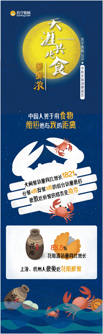 如今,大閘蟹已經(jīng)成為人們中秋餐桌上的標(biāo)配。今年4月,蘇寧生鮮與陽(yáng)澄湖大閘蟹協(xié)會(huì)展開(kāi)戰(zhàn)略合作,蘇寧線上自營(yíng)的大閘蟹全部都來(lái)自陽(yáng)澄湖。9月以來(lái),蘇寧易購(gòu)大閘蟹的銷量同比增長(zhǎng)為1821%,南京、上海、北京、廣州、沈陽(yáng)成為“最敢吃螃蟹”的城市,4兩公蟹3兩母蟹的組合最受消費(fèi)者歡迎。此外,蘇寧易購(gòu)花雕酒的銷量也同比增長(zhǎng)83.5%,數(shù)據(jù)顯示,上海和杭州人最愛(ài)吃花雕醉蟹。
