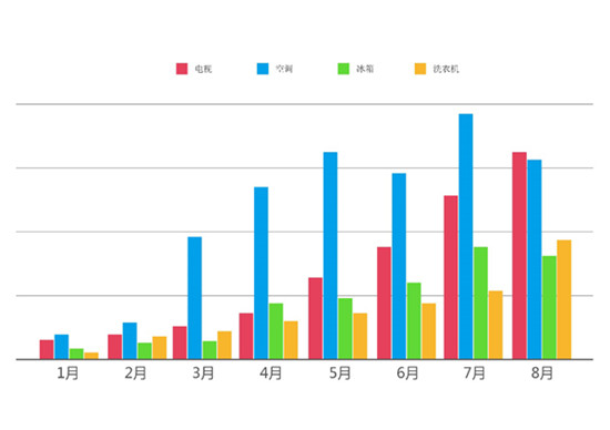 數(shù)據(jù)顯示,相較于1月,8月份凈水器在全國零售云店的銷量增長1390%,洗碗機(jī)增長1300%,掃地機(jī)器人增長573%,吸塵器增長490%,單反相機(jī)增長400%。