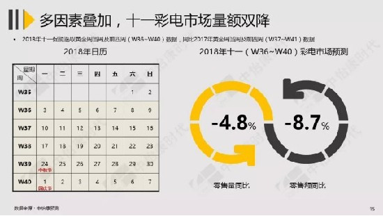 中怡康預(yù)測,今年十一彩電市場或呈現(xiàn)“量額雙降”局面,其中零售量同比下降4.8%,零售額則同比下降8.7%,長假對彩電行業(yè)所起的作用將小于預(yù)期。分析原因主要有兩點(diǎn):一是每年促銷節(jié)點(diǎn)太多,消費(fèi)者應(yīng)接不暇;二是新興營銷模式層出不窮,造成消費(fèi)分流。