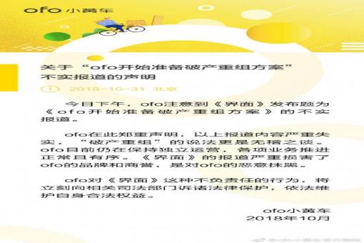 ofo開始準備破產(chǎn)重組方案?,官方回應:無稽之談