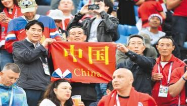 在圣彼得堡舉行的俄羅斯隊對陣埃及隊的世界杯小組賽中,中國球迷在看臺上打出條幅。