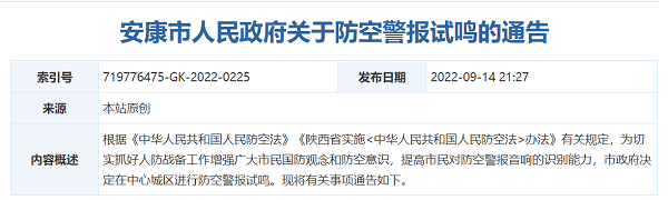 為貫徹落實(shí)《中華人民共和國人民防空法》,全面提高我市防空警報(bào)快速反應(yīng)和廣大群眾對警報(bào)音響識別能力,切實(shí)增強(qiáng)人民群眾的國防意識和對重大自然災(zāi)害的防范意識,安康市政府決定,2022年9月18日(星期日)上午9時05分至9時35分在全市試鳴防空警報(bào)。請廣大市民保持正常的工作和生活秩序。