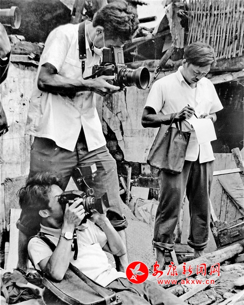 安康地區(qū)群藝館李西平(左一)當(dāng)年拍攝的戰(zhàn)士手流鮮血待命的圖片獲“大眾攝影”年賽一等獎(jiǎng)。地委宣傳部的宋選成(左三,已病逝)拍攝了倒塌前的邦克樓。陜西日?qǐng)?bào)社胡武功(左四)的作品《當(dāng)洪水襲來(lái)之際》獲得當(dāng)年最佳新聞攝影獎(jiǎng)。安康日?qǐng)?bào)社記者張會(huì)鑒(左五,已病逝)正在采訪(fǎng)中。蘭州某部隊(duì)的王紅(右一)。