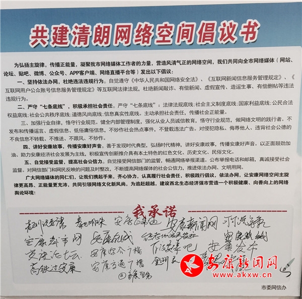廣大網(wǎng)絡(luò)媒體的同仁們,讓我們攜起手來,齊心協(xié)力,認(rèn)真履行社會責(zé)任,積極踐行倡議,依法辦網(wǎng),讓安康網(wǎng)絡(luò)空間主旋律更高昂、正能量更充沛,共同引領(lǐng)網(wǎng)絡(luò)文化新風(fēng)尚,為追趕超越,建設(shè)西北生態(tài)經(jīng)濟(jì)強(qiáng)市營造一個積極健康、向善向上的網(wǎng)絡(luò)輿論環(huán)境!
