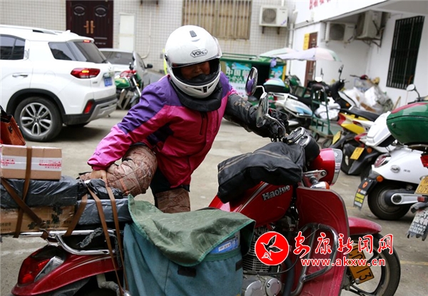 新春之際,陜南天氣依然寒冷。趙明翠戴上頭盔,捆綁好厚厚的護(hù)膝,艱難得跨上摩托車(chē),點(diǎn)火起步出發(fā),開(kāi)始了一天的投遞工作。記者驅(qū)車(chē)緊跟隨其后,在很多拐彎和上下坡路段,我們看到趙明翠為了平衡摩托車(chē),經(jīng)常是兩腳尖著地。