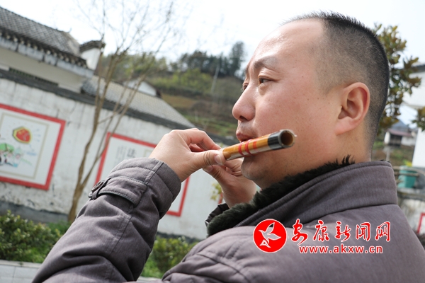 2017年,村上給胡珂和楊先彩在學(xué)校協(xié)調(diào)了兩間房子作為他們的宿舍,閑暇時胡珂會拿起心愛的笛子在學(xué)校的操場上演奏一曲,悠揚(yáng)的笛聲回蕩在村子的上空,其中也寄托著胡珂對妻兒的想念。實(shí)習(xí)記者 滕靜 攝