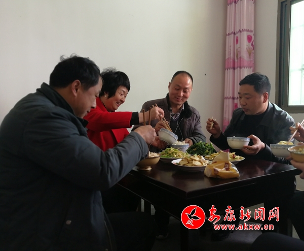 中午吃飯一般都是幾個素菜,和村上干部一起邊吃邊聊。楊先彩做過手術(shù),飯量小,經(jīng)常把飯撥給胡珂。記者 陳俊 攝