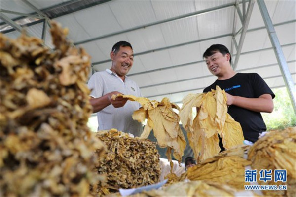 饒峰鎮(zhèn)齊心村永根雙帶種植專業(yè)合作社理事長華永根(左)和一名鎮(zhèn)干部在查看分揀好的煙葉(9月5日攝)。