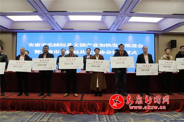 會(huì)上,趙俊民與于福亮共同為安康市毛絨玩具行業(yè)協(xié)會(huì)揭牌,協(xié)會(huì)新當(dāng)選會(huì)長(zhǎng)沈愛(ài)華作表態(tài)發(fā)言。會(huì)議還向30余家企業(yè)兌現(xiàn)了毛絨玩具文創(chuàng)產(chǎn)業(yè)發(fā)展基金獎(jiǎng)勵(lì)。