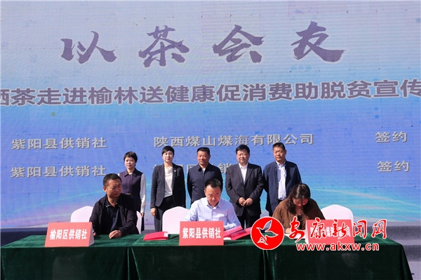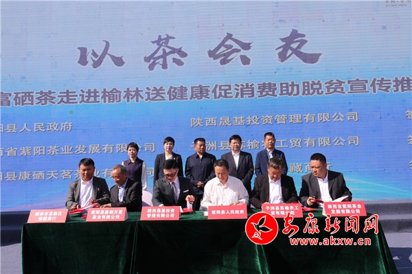 活動儀式上,國家一級茶葉審評技師、陜西省茶人聯(lián)誼會會長韓星海對安康紫陽富硒茶作專業(yè)點評,紫陽縣有關部門負責人作紫陽招商推介、紫陽富硒茶推介、紫陽旅游推介;顒舆M行了簽約、紫陽富硒茶專家點評和“紫陽富硒特產(chǎn)營銷中心”授牌儀式。紫陽縣人民政府與陜西晟基投資管理有限公司簽訂富硒礦泉水綜合開發(fā)項目;陜西省紫陽茶業(yè)發(fā)展有限公司與子洲縣蘇榆農(nóng)工貿(mào)有限公司簽訂“紫陽富硒茶、子州”養(yǎng)生茶項目合作開發(fā)協(xié)議;紫陽縣康硒天茗茶業(yè)有限公司與榆林市高新區(qū)惟藏商行簽訂紫陽富硒茶購銷協(xié)議;紫陽縣供銷聯(lián)社與陜西煤山煤海有限公司簽訂共建“榆林市紫陽富硒特產(chǎn)營銷中心”協(xié)議,紫陽縣供銷聯(lián)社與榆陽區(qū)供銷聯(lián)社簽訂“地方特產(chǎn)供銷互促合作協(xié)議”。