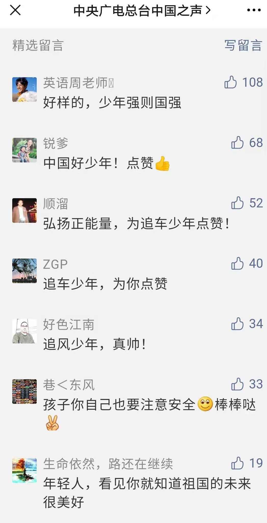 新華網(wǎng)、央視新聞、中央廣電總臺(tái)中國(guó)之聲等多家央媒關(guān)注報(bào)道安康這名“追車少年”,贊揚(yáng)他的善行義舉,網(wǎng)友紛紛留言:“少年強(qiáng)則國(guó)強(qiáng)”,“看到你就知道祖國(guó)的未來很美好”……