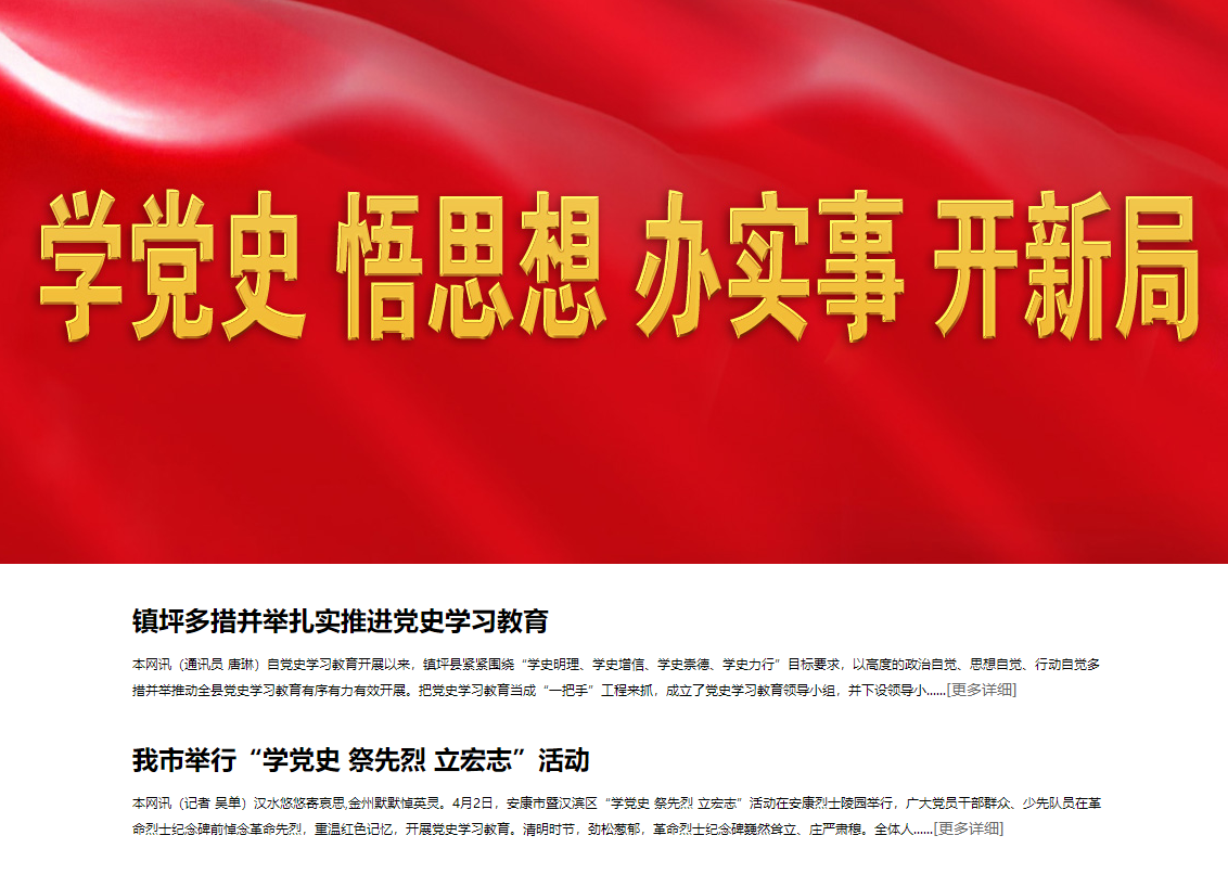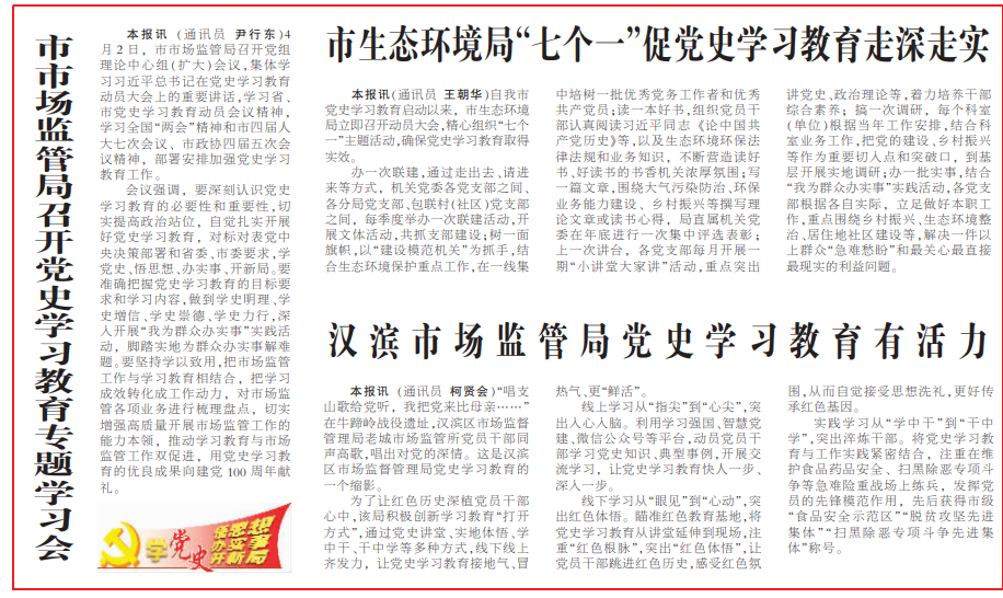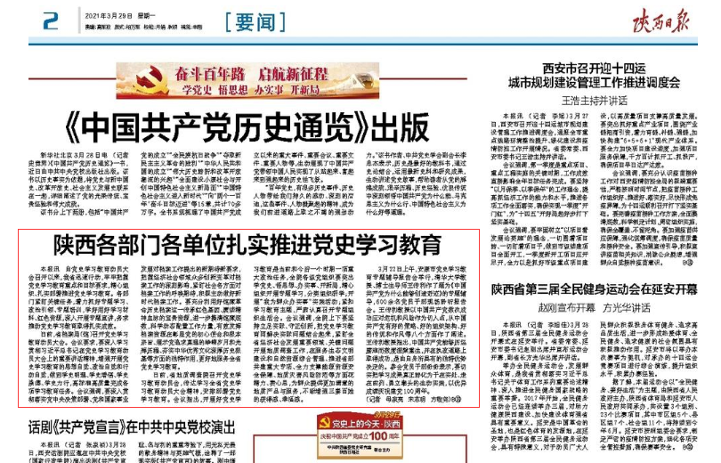 3月29日以來(lái),《陜西日?qǐng)?bào)》以《全省各部門(mén)各單位扎實(shí)推進(jìn)黨史學(xué)習(xí)教育》為題,對(duì)我市舉行首場(chǎng)黨史學(xué)習(xí)教育專(zhuān)題報(bào)告會(huì)進(jìn)行了報(bào)道。緊接著,“學(xué)習(xí)強(qiáng)國(guó)”推出了《陜西安康市漢濱區(qū):忠魂千秋耀山鄉(xiāng) 慷慨奮進(jìn)著新篇》《激戰(zhàn)牛蹄嶺 碧血映山河》兩篇報(bào)道。陜西廣播電視臺(tái)、群眾新聞網(wǎng)、西部網(wǎng)集中播出我市策劃拍攝的《繼承廖乾五的革命精神 凝聚起百年奮進(jìn)新征程強(qiáng)大力量》的主題報(bào)道!妒形N嘧釉谂L銕X開(kāi)展黨史學(xué)習(xí)教育》視頻新聞被新華網(wǎng)、陜西法制網(wǎng)轉(zhuǎn)載。