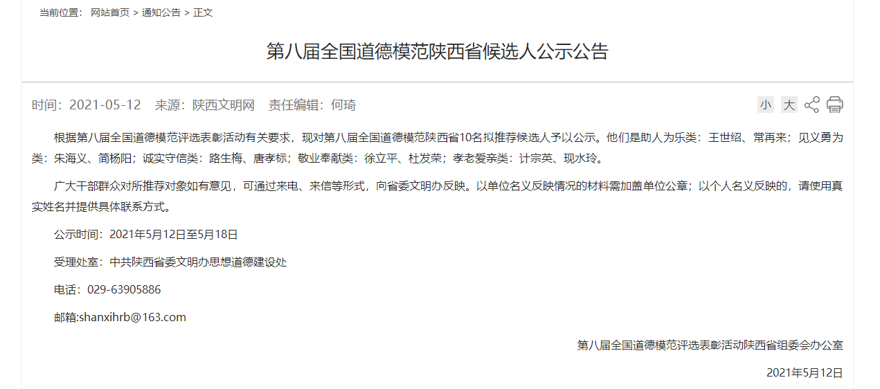 5月12日,陜西文明網(wǎng)發(fā)布第八屆全國道德模范陜西省候選人公示公告,對(duì)第八屆全國道德模范陜西省10名擬推薦候選人予以公示,我市旬陽縣居民朱海義入選見義勇為候選人名單。