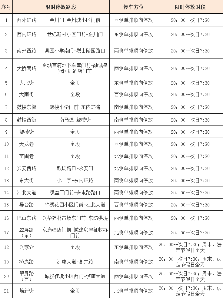 本網(wǎng)訊 5月31日,安康市公安局漢濱分局交警大隊(duì)發(fā)布公告,為落實(shí)“我為群眾辦實(shí)事”公安交管12項(xiàng)便利措施,緩解城鎮(zhèn)老舊小區(qū)“停車難”問題。經(jīng)研究,自2021年6月1日起,安康城區(qū)17條路段準(zhǔn)許夜間停放車輛,4條路段準(zhǔn)許夜間、周末、法定節(jié)假日全天停放車輛。4Rs安康新聞網(wǎng)