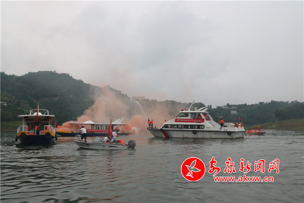雨中的瀛湖碧水粼粼,四周山嵐氤氳繚繞。上午九時,演習(xí)活動冒雨開始,劉建平在致辭中闡釋了本次演習(xí)的重要意義,感謝省上領(lǐng)導(dǎo)專家蒞臨指導(dǎo),強調(diào)要不斷完善強化水上應(yīng)急措施,確保賽事圓滿進行,并預(yù)祝演習(xí)圓滿成功。隨即包括應(yīng)急響應(yīng)、水上綜合演練(包含搜救打撈、消防滅火、傷員救治、遇險船拖)、水上防風(fēng)預(yù)警演練、游泳賽場運動員救援四部分演練正式拉開帷幕。首先是應(yīng)急響應(yīng),各救援分隊向指定地點集結(jié)并檢查報告救援船艇、設(shè)備、人員到位情況,總指揮下達(dá)演習(xí)開始指令。緊接著是水上綜合演練,只見翠屏島南側(cè)寬闊的湖面上,兩艘東西方向相向而行的客船發(fā)生“碰撞,一艘起火,有人員落水”,接到救援信息后,現(xiàn)場總指揮向瀛湖海事局下達(dá)救援指令,執(zhí)行組長分別向海事、景區(qū)公安、交運公司等救援隊發(fā)出指令,十?dāng)?shù)艘救援船只接到命令后迅速趕赴事發(fā)現(xiàn)場,在湖面掀起了層層的浪花,有的負(fù)責(zé)事故水域交通管制、碼頭及救援現(xiàn)場秩序維護,有的負(fù)責(zé)事故船只消防滅火、定點?考巴蠋ё鳂I(yè),有的負(fù)責(zé)水域搜尋救撈、旅客轉(zhuǎn)移……現(xiàn)場氣氛緊張、忙而不亂,打撈搜救任務(wù)成功完成,火情得到有效控制,失去動力的遇險船舶被拖帶至安全地點,3名“溺水昏迷人員”成功實施現(xiàn)場急救(心肺復(fù)蘇)并轉(zhuǎn)移至岸上醫(yī)療救助點實施救治。隨后是水上防風(fēng)預(yù)警演練,模擬瀛湖核心景區(qū)局部水域突起大風(fēng)威脅船舶航行安全,海事局立即發(fā)布禁航通知,組織在航船舶及乘客就近?勘茈U。最后是游泳賽場運動員救援,“游泳賽事中突然有1名運動員出現(xiàn)身體不適需要救援”,接到救援信號后,水上應(yīng)急隊伍迅速駕駛執(zhí)法沖鋒舟趕到事發(fā)水域,對運動員進行施救并轉(zhuǎn)運至醫(yī)療點。