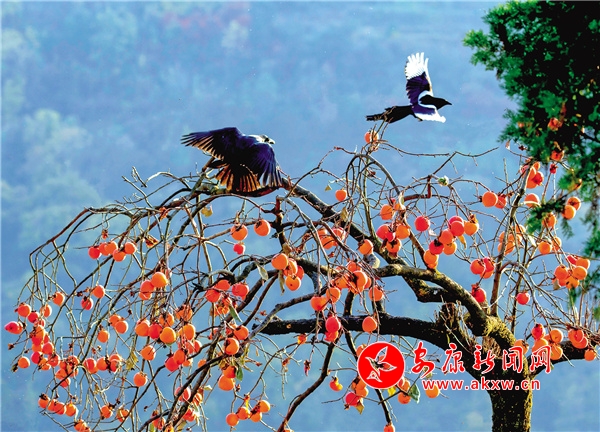 一次在漢濱區(qū)茨溝鎮(zhèn)西溝村拍鳥,當時正值秋收時節(jié),柿子樹上掛滿了熟透的柿子。張東風看到兩位農(nóng)民在摘柿子,但是他們并沒有把樹上的柿子全部摘完,而是留了一些紅彤彤的柿子掛在樹上。