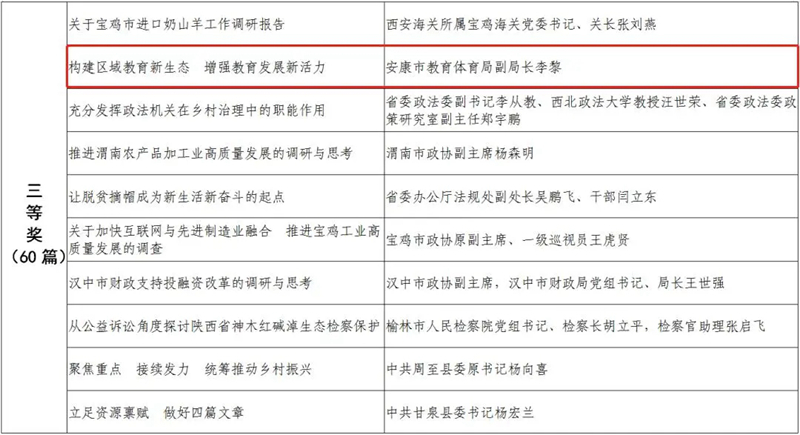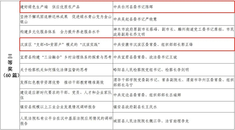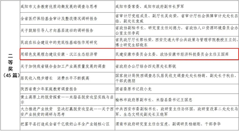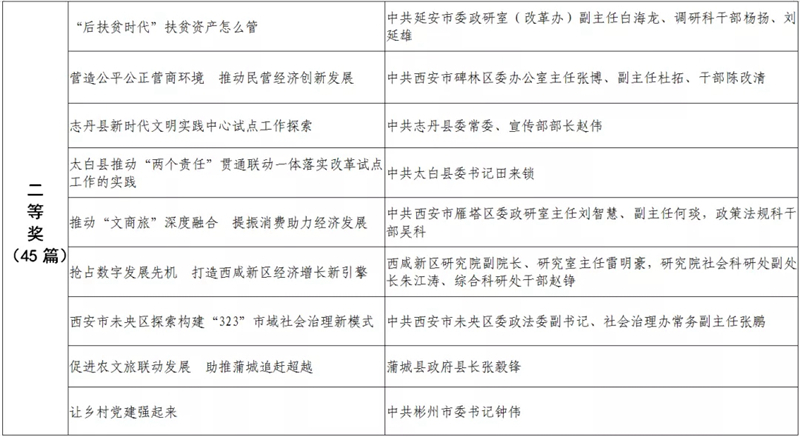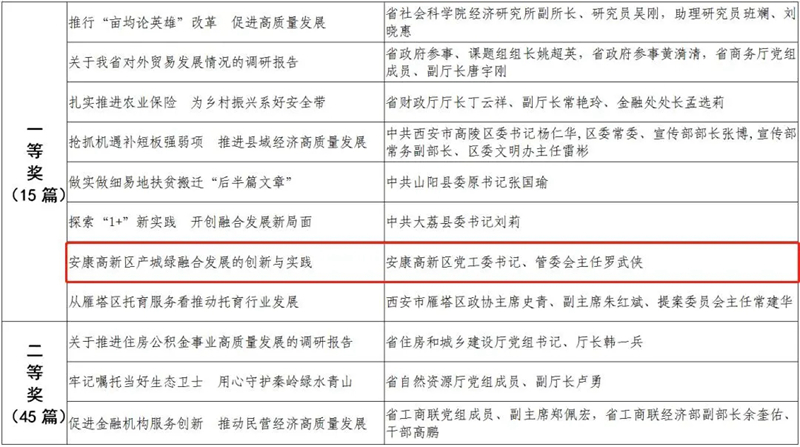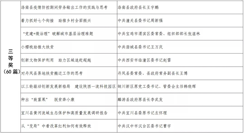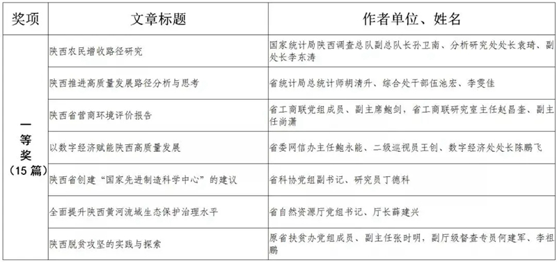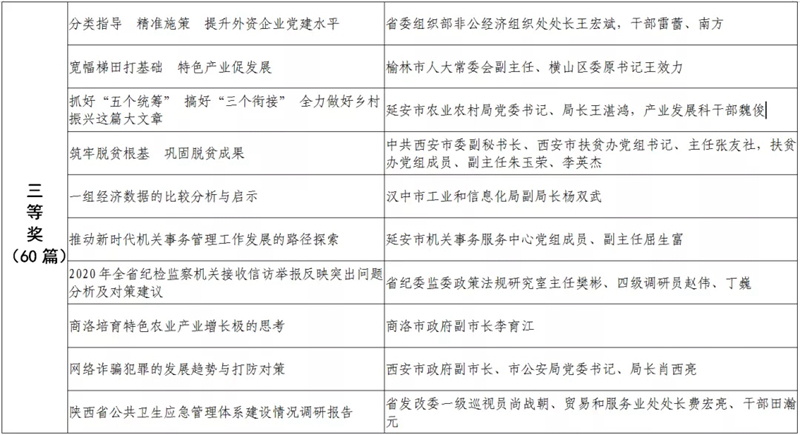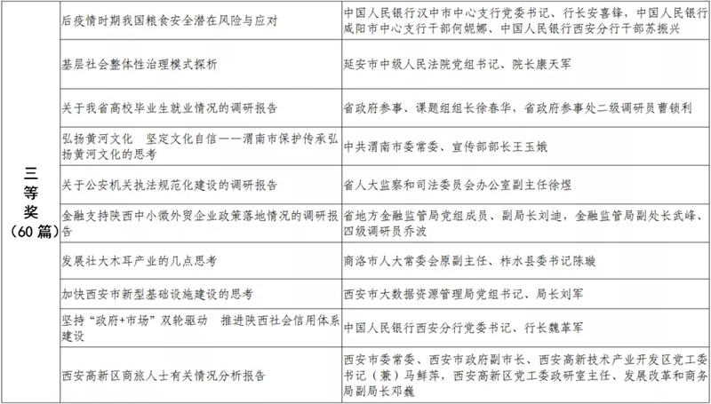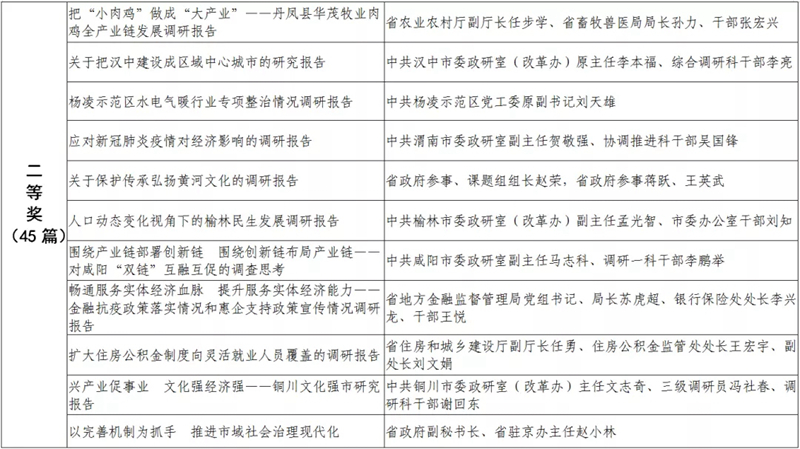 據(jù)悉,全省黨政領(lǐng)導(dǎo)干部優(yōu)秀調(diào)研成果評選工作迄今已開展了18年。本次評選活動從全省市縣兩級和省級各部門上報的487篇縣處級以上黨政領(lǐng)導(dǎo)干部調(diào)研報告中,評出獲獎優(yōu)秀調(diào)研成果120篇。其中,《陜西農(nóng)民增收路徑研究》等15篇獲一等獎,《關(guān)于推進(jìn)住房公積金事業(yè)高質(zhì)量發(fā)展的調(diào)研報告》等45篇獲二等獎,《后疫情時期我國糧食安全潛在風(fēng)險與應(yīng)對》等60篇獲三等獎。