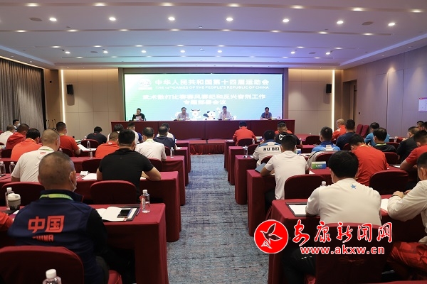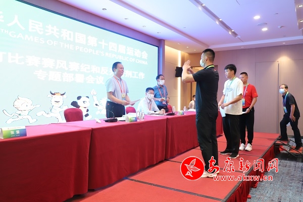 會議傳達(dá)學(xué)習(xí)了《體育總局辦公廳關(guān)于印發(fā)<第十四屆全國運動會賽風(fēng)賽紀(jì)違規(guī)處罰規(guī)定>的通知》;宣讀了《第十四屆全運會武術(shù)散打決賽運動隊賽風(fēng)賽紀(jì)和反興奮劑工作責(zé)任書》、《第十四屆全國運動會武術(shù)散打決賽領(lǐng)隊、教練員參賽承諾書》。