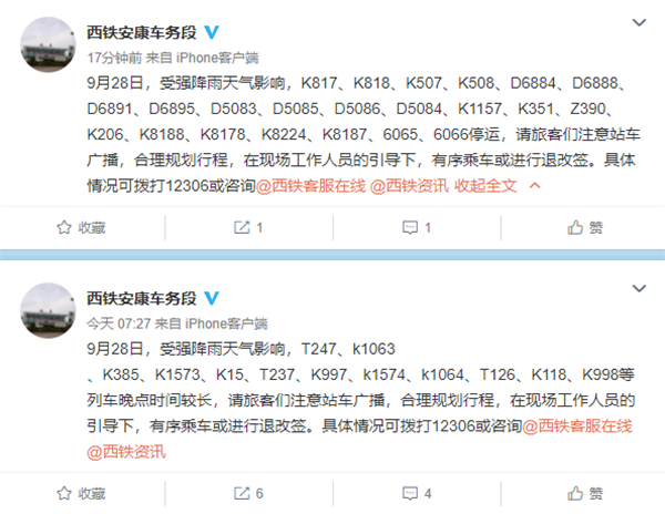 本網(wǎng)訊 據(jù)西鐵安康車務(wù)段最新消息,9月28日,受強(qiáng)降雨天氣影響,T247、k1063、K385、K1573、K15、T237、K997、k1574、k1064、T126、K118、K998等列車晚點(diǎn)時(shí)間較長,請(qǐng)旅客們注意站車廣播,合理規(guī)劃行程,在現(xiàn)場(chǎng)工作人員的引導(dǎo)下,有序乘車或進(jìn)行退改簽。具體情況可撥打12306咨詢。