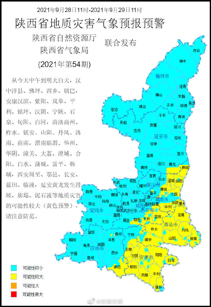 本網(wǎng)訊  陜西省自然資源廳與陜西省氣象局聯(lián)合發(fā)布地質(zhì)災(zāi)害氣象預(yù)報(bào)預(yù)警:預(yù)計(jì)9月28日11時(shí)至9月29日11時(shí),安康漢濱、紫陽(yáng)、嵐皋、平利、鎮(zhèn)坪、漢陰、寧陜、石泉、旬陽(yáng)、白河發(fā)生滑坡、崩塌、泥石流等地質(zhì)災(zāi)害的可能性較大(黃色預(yù)警),注意防范。YBQ安康新聞網(wǎng)
