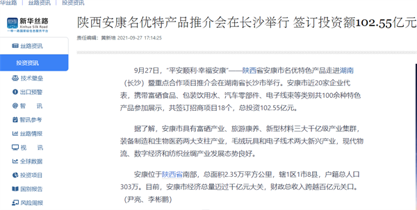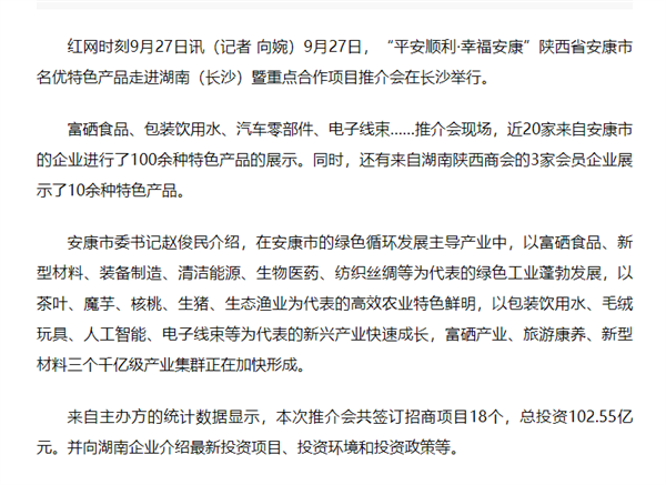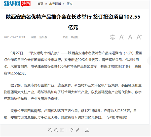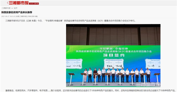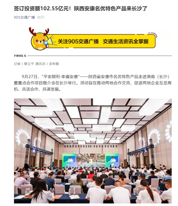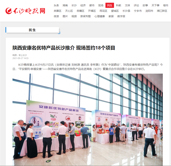 本網(wǎng)訊 9月27日,由中共安康市委、安康市人民政府,陜西省商務廳聯(lián)合主辦的“平安順利·幸福安康——陜西省安康市名優(yōu)特色產(chǎn)品走進湖南(長沙)暨重點合作項目推介會”在長沙市成功舉辦。新華社、中國交通廣播、中國報道、湖南日報、長沙晚報、三湘都市報、國際在線、紅網(wǎng)等中省、長沙以及駐長多家媒體紛紛給予報道。媒體不僅高度贊揚兩地的合作成果,并對安康有了一個嶄新的評價和認識。一起看看“老親戚”長沙眼中的“老鄰居”安康是什么樣!B2S安康新聞網(wǎng)