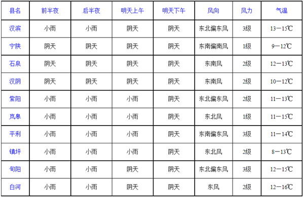 預(yù)計今天晚上陰天有小雨,明天白天陰天,南部小雨;12日陰天轉(zhuǎn)多云;13日多云間晴天;14日多云轉(zhuǎn)陰天;15日小雨轉(zhuǎn)中雨;16日小雨轉(zhuǎn)陰天;17日陰天轉(zhuǎn)多云。WWh安康新聞網(wǎng)
