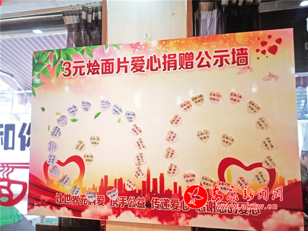 “感謝XX蕊捐款10元,感謝馬遠鵬律師捐款20元,感謝XX默為環(huán)衛(wèi)工人認(rèn)購燴面片10份捐款30元,感謝山茶花捐款80元,感謝XX娃捐款300元……”大廳西墻壁新設(shè)置的“愛心捐款公示墻”上,貼滿了連日來通過微信、現(xiàn)金等方式,認(rèn)購燴面片的愛心人士的昵稱和捐款金額。