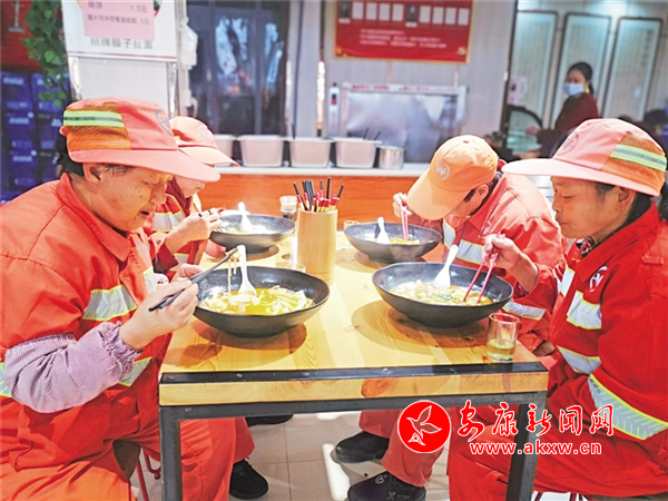 十幾年前,向美玉從湖南遠嫁至安康,幾年前加入了“城市美容師”的行列,負責(zé)清掃城區(qū)高井加油站附近的街面,平日起早貪黑,緊趕慢趕,區(qū)域內(nèi)衛(wèi)生才能保持干凈。如果中途回家吃個飯,就太耽誤時間了。得知天源飯莊為環(huán)衛(wèi)工人準(zhǔn)備了熱氣騰騰的燴面片,她便和同事一起過來就餐。“冬天能吃一碗美味的燴面片,我們心里暖暖的,感謝老板和愛心人士對我們的關(guān)愛。”向美玉說。