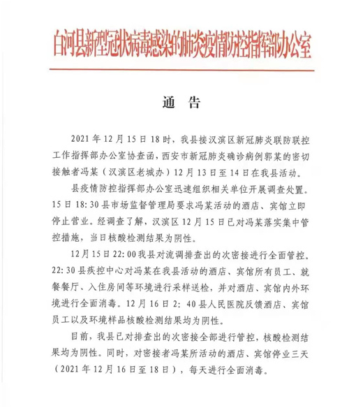 縣疫情防控指揮部辦公室迅速組織相關(guān)單位開展調(diào)查處置。15日18:30縣市場監(jiān)督管理局要求馮某活動(dòng)的酒店、賓館立即停止?fàn)I業(yè)。經(jīng)調(diào)查了解,漢濱區(qū)12月15日已對(duì)馮某落實(shí)集中管控措施,當(dāng)目核酸檢測(cè)結(jié)果為陰性。