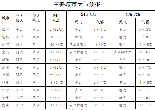 3月1日:陜北、關(guān)中多云轉(zhuǎn)晴天,陜南陰天轉(zhuǎn)多云,陜南南部局地有小雨。日平均氣溫陜北黃河沿線、關(guān)中中東部下降4℃左右。