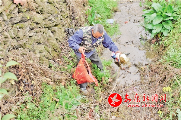“我前兩天看溝里石頭堆中間有一件被丟掉的衣服,得趕緊撈出來,可不敢等到春天雨水多了。”李輝智回頭對章彩云說,“那是的,現(xiàn)在溝里干凈著呢,我一會兒回家找個長竹竿把衣服勾出來,不能讓這些影響了水質。”章彩云回應道。