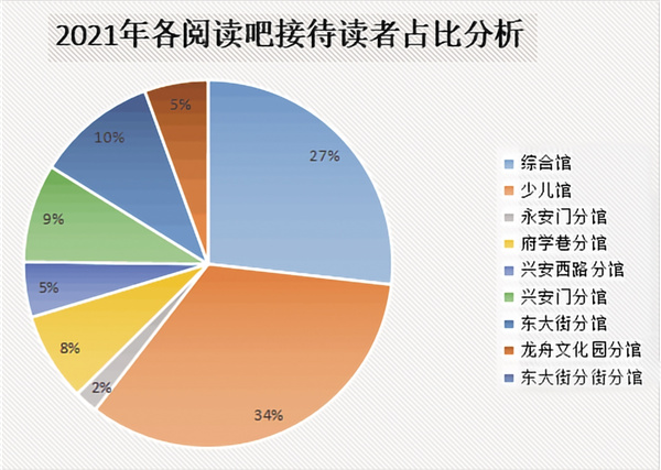 2021年,接待人數(shù)最多的閱讀場館也是少兒館,接待人數(shù)147188人次,占全年接待讀者總?cè)藬?shù)的34%。借閱排行榜的前20名均為少兒圖書,其中楊紅櫻所著《笑貓日記·藍(lán)色的兔耳朵草》全年借閱次數(shù)達(dá)到97次。這表明,隨著雙減政策的落地和少兒閱讀積分存折、親子閱讀等少兒閱讀推廣活動的開展,極大地調(diào)動了少兒群體的閱讀積極性,圖書館正逐漸成為學(xué)生群體課余生活的新選擇。