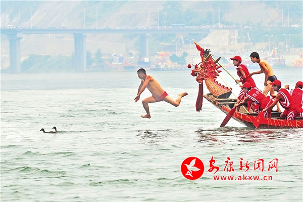 2012年第十二屆安康龍舟節(jié),來自安康冬泳隊(duì)的200余名冬泳愛好者助興龍舟節(jié)開幕式。 邵向東 攝