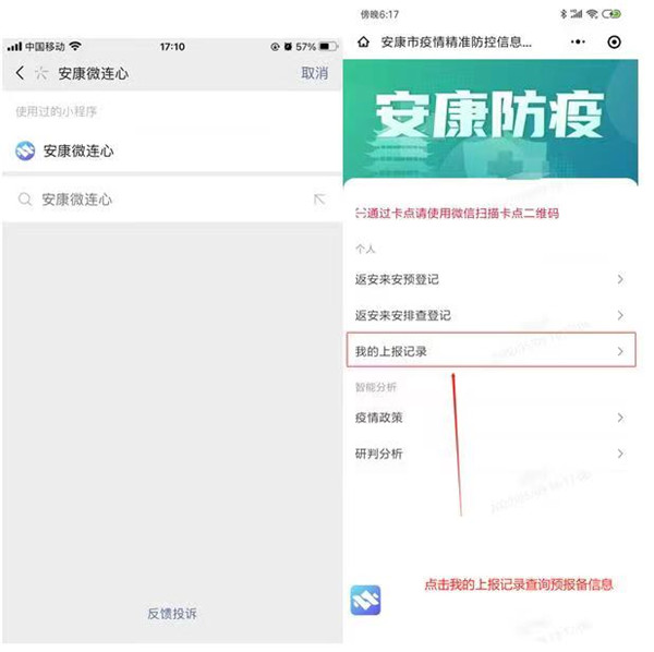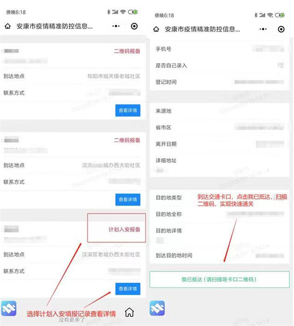 第三步,通過(guò)交通卡口,打開“安康微連心”微信小程序,點(diǎn)擊“安康防疫”,進(jìn)入“我的上報(bào)記錄”,點(diǎn)擊“查看詳情”,點(diǎn)擊“我已抵達(dá)” 并掃描交通卡口“返安排查登記二維碼”確認(rèn)抵達(dá)。