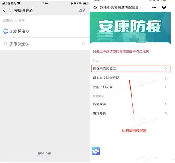 第一步,打開微信,搜索“安康微連心”小程序(首次登記需先實(shí)名認(rèn)證),點(diǎn)擊“安康防疫”,點(diǎn)擊“返安來(lái)安預(yù)登記”。