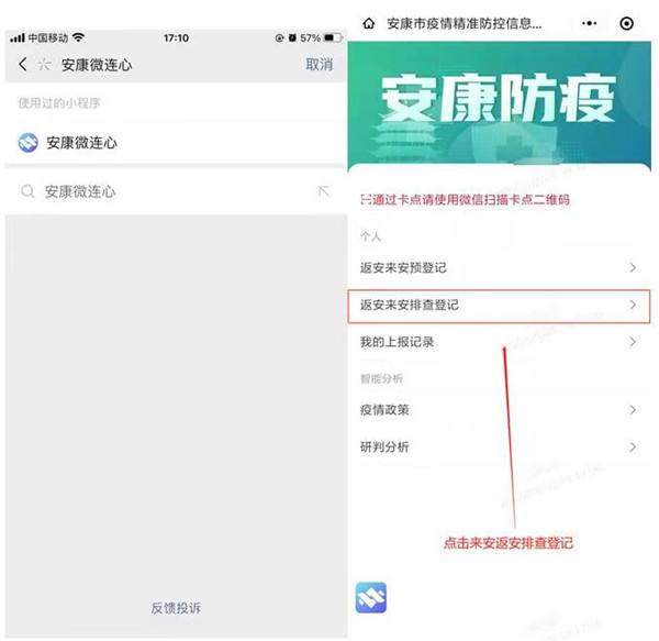 第一步,打開微信,搜索“安康微連心”小程序(首次登記需先實(shí)名認(rèn)證),點(diǎn)擊“安康防疫”,點(diǎn)擊“返安來(lái)安排查登記”。