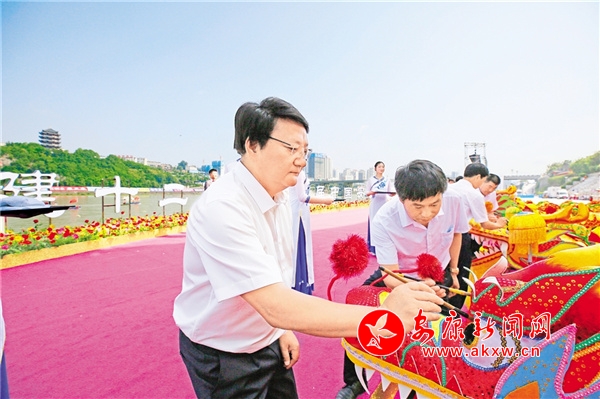 2021年,第二十一屆安康龍舟節(jié)開幕式上,嘉賓為龍頭點(diǎn)睛。 潘潤(rùn)生 攝