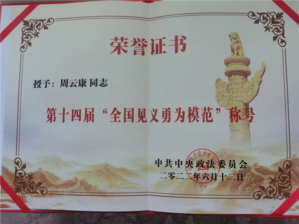 獲此殊榮,周云康感到十分激動,他說:“在人民群眾有生命危險時,見義勇為,挺身而出,是自己的本能,很榮幸能受到國家表彰,國家和人民給了自己這么高的榮譽(yù),作為一名志愿者,今后將不忘初心,繼續(xù)傳遞見義勇為的正能量,帶動更多的人,積極主動投身見義勇為的行列之中,為平安安康做出貢獻(xiàn)。”