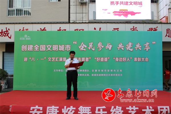 本網(wǎng)訊(通訊員 趙小玉 譚成鈴)為扎實(shí)推進(jìn)全國文明城市創(chuàng)建工作,營(yíng)造“全民參與,共建共享”的濃厚氛圍,進(jìn)一步掀起幫扶社區(qū)的創(chuàng)文工作熱潮,8月1日晚,國家統(tǒng)計(jì)局安康調(diào)查隊(duì)聯(lián)合市、區(qū)城市管理執(zhí)法局、朝陽社區(qū)居委會(huì)共同舉辦了朝陽社區(qū)“創(chuàng)建文明城市‘全民參與,共建共享’”迎“八一”文藝匯演暨“優(yōu)秀志愿者”“好婆婆”“身邊好人”表彰活動(dòng)。市人大常委會(huì)黨組成員、副主任趙立根出席活動(dòng)并講話。