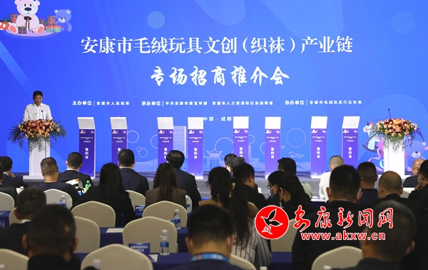 晚秋,蓉城。中國西部國際博覽城9號大廳里座無虛席,氣氛熱烈。2022年11月1日3時許,安康市毛絨玩具文創(chuàng)(織襪)產(chǎn)業(yè)專場招商推介會如期召開。安康市常務(wù)副市長從中國玩具和嬰童用品協(xié)會會長梁梅手中接過“建設(shè)毛絨玩具文創(chuàng)產(chǎn)業(yè)集群建設(shè)突出貢獻(xiàn)獎”的金字牌匾時,大廳里響起經(jīng)久不息的熱烈掌聲,許多人百感交集。