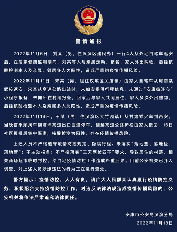 上述人員不嚴(yán)格遵守疫情防控規(guī)定、隱瞞行程;未落實(shí)“落地查、落地檢、落地管”;不主動(dòng)報(bào)備;不嚴(yán)格落實(shí)“三天兩檢四不”要求,導(dǎo)致居住的村落、相關(guān)商場(chǎng)超市臨時(shí)封控,給當(dāng)?shù)匾咔榉揽毓ぷ髟斐蓢?yán)重后果。目前公安機(jī)關(guān)已介入調(diào)查,對(duì)上述人員涉嫌違法的行為正在進(jìn)行查處。jv3安康新聞網(wǎng)