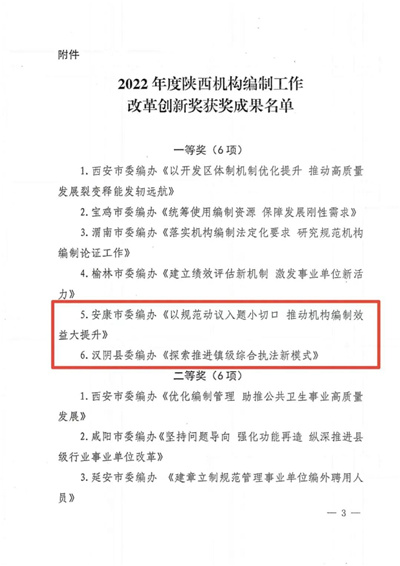 日前,2022年度陜西省機(jī)構(gòu)編制工作改革創(chuàng)新獎(jiǎng)評(píng)選結(jié)果揭曉,入選全省機(jī)構(gòu)編制系統(tǒng)20項(xiàng)獲獎(jiǎng)成果中,我市3項(xiàng)改革創(chuàng)新成果斬獲一等獎(jiǎng)2名、二等獎(jiǎng)1名,獲獎(jiǎng)等次和數(shù)量位居全省第一。