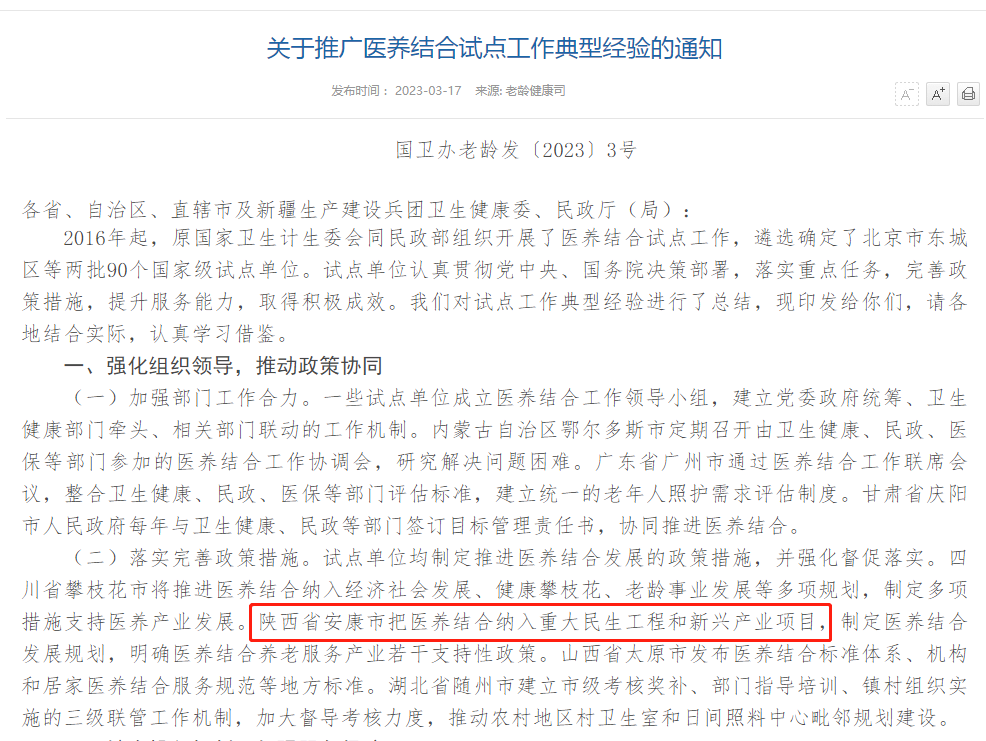 近日,國家衛(wèi)健委、民政部聯(lián)合發(fā)文推廣陜西安康市等醫(yī)養(yǎng)結(jié)合試點工作典型經(jīng)驗!锻ㄖ氛J為,試點期間,陜西省安康市把醫(yī)養(yǎng)結(jié)合納入重大民生工程和新興產(chǎn)業(yè)項目,制定醫(yī)養(yǎng)結(jié)合發(fā)展規(guī)劃,明確醫(yī)養(yǎng)結(jié)合養(yǎng)老服務產(chǎn)業(yè)若干支持性政策相關舉措取得積極成效。